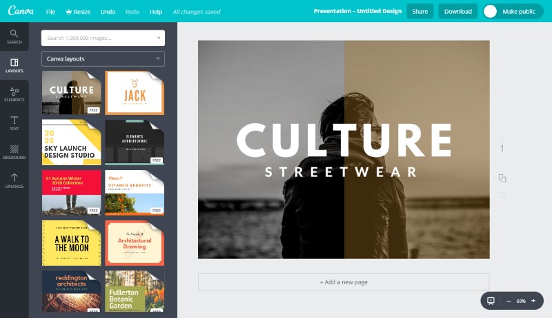 Canva offers creation of graphics using multiple pre-created layouts and templates with an easy to use web editor. You can easily create social media images, Instagram Reels, TikTok videos, posters, flyers, book covers, letterheads and a lot more graphic items using their editor. Text, font, colors and images can be changed easily and you are allowed to download and share your creation for free.