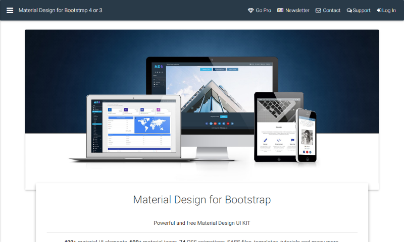 MD Bootstrap (MDB) is an extensive Material design UI kit which is available for many JavaScript flavors such as React, VueJS, Angular and JQuery. The free version of this UI Kit offers 400+ material UI elements, 600+ material icons, 70+ CSS animations along with free templates to build a material website. Upon upgrading to the premium version, you get access to 2000+ UI components, premium templates as well as premium support from the developers.